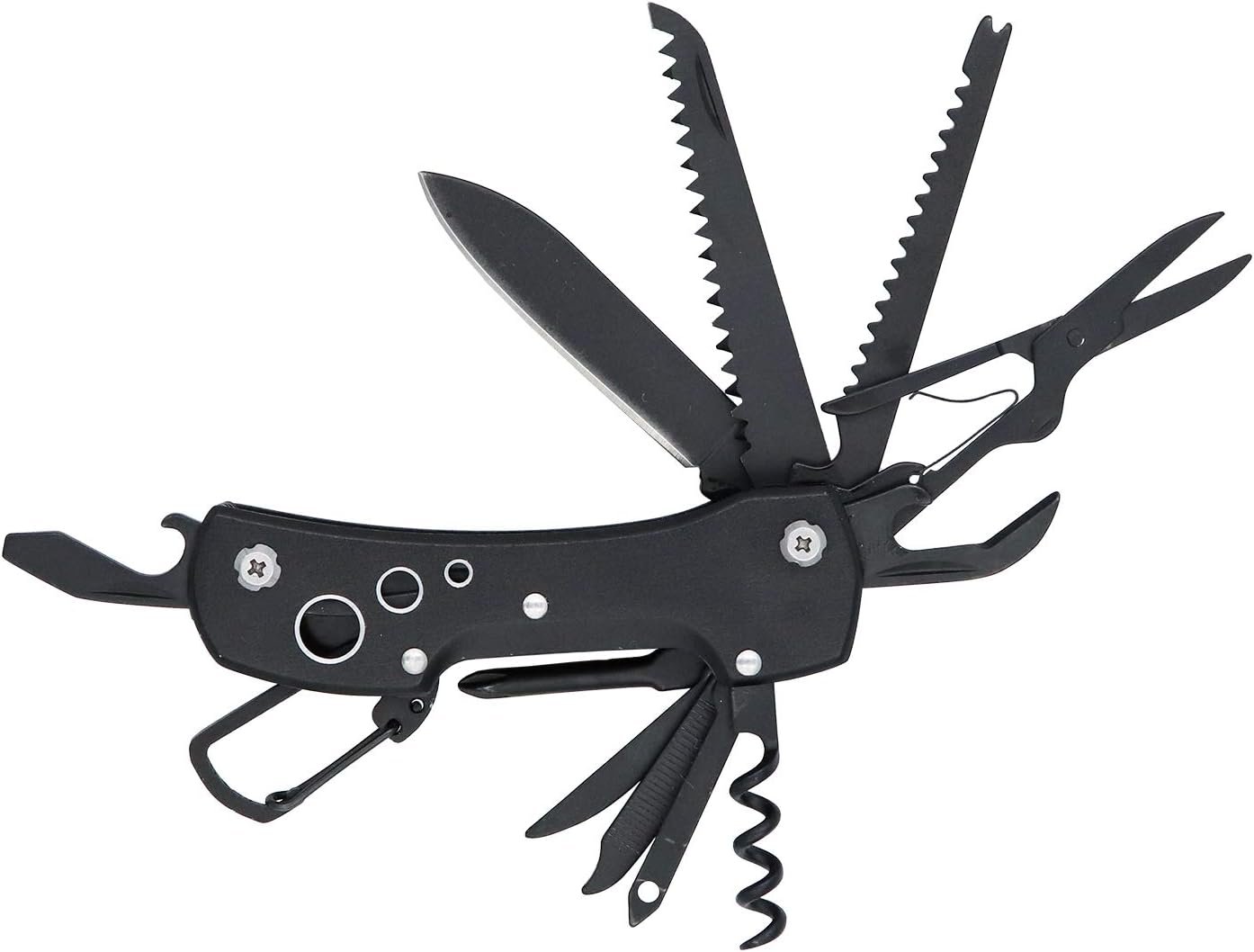 • 15-in-1-Multifunktionswerkzeug mit Messer, Säge, Fischentschupper, Hakenlöser, Schere, Flaschenöffner, Schlitzschraubendreher, Kreuzschlitzschraubendreher, Eisbrecher, Metallfeile, Nagelreiniger, Nadel, Korkenzieher und Schlüsselring